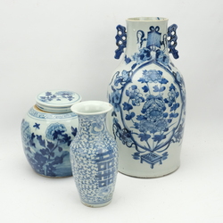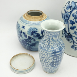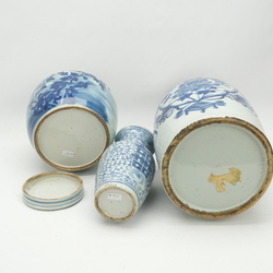 | Omschrijving | Twee Chinees porseleinen vazen en een gemberpot met deksel. Blauw/wit met florale decors. 19e eeuws. |