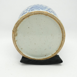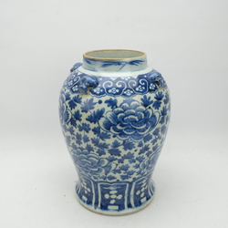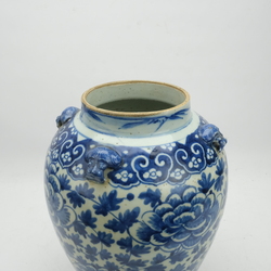 | Omschrijving | Een Chinees porseleinen voorraad pot of vaas. Blauw/wit met rondom een decor van pioenrozen en versierd met vier koppen van tempelleeuwtjes. 19e eeuws |