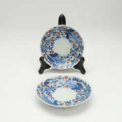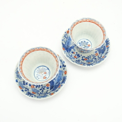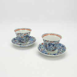 | Omschrijving | Twee antieke Japans eierschaal porseleinen chocolade kop en schotels, Blauw/wit met boven glazuur rood, groen en goud decor van lijzen in de tuin. |