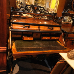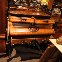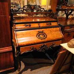 | Omschrijving | Een 19e eeuwse wortelnoten gefineerde secretaire, Hollands, Willem III, met twee lades boven en één onder de klep. Rijk gestoken, klep versierd met intarsia, op krulpoten. |