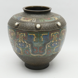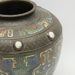 | Omschrijving | Een 20e eeuwse Chinees bronzen champleve vaas, ingelegd met stenen. 23 cm hoog, zonder sokkel |