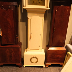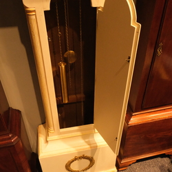 | Omschrijving | Een 20e eeuws staande klok in witte kast, met spreuk op de wijzerplaat. Kast onderaan versierd met bronzen lauwerkrans |