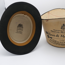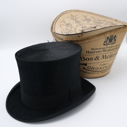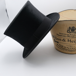 | Omschrijving | Een antieke hoge hoed, ca. 1900, gemerkt ‘Hat Manufactory London’ & ‘Bos & Meijering, Vischmarkt 51 Groningen’. In originele doos. |