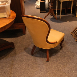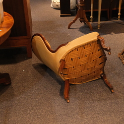 | Omschrijving | Een antiek 19e eeuws mahoniehouten gefineerd breistoeltje met gecapitonneerde rugleuning, op krolpootjes met wieltjes |