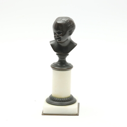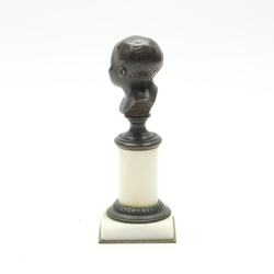 | Omschrijving | Een antiek bronzen beeldje, buste van een jong kind, ca. 1900, op marmeren sokkel. Gesigneerd ‘Marol’ |