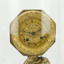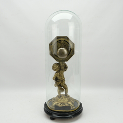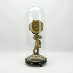 | Omschrijving | Een antieke bronzen pendule, achtkantig verguld uurwerk met slinger, ca. 1830-1840, gedragen door een gegoten bronzen putti. Vermoedelijk een marriage, het geheel onder een stolp. |