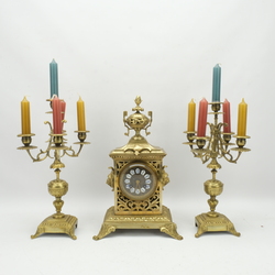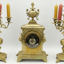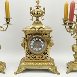 | Omschrijving | Een antieke laat 19e of vroeg 20e eeuwse Franse bronzen pendule, bekroond met een sierurn. Wijzerplaat gedeeltelijk geemailleerd, met Romeinse cijfers. Met twee bronzen vijflichts kandelaars. |