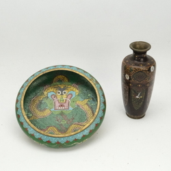 | Omschrijving | Een Japans cloisoné op messing vaas met decor van draken, bloemen en vogels, Meiji periode. Hierbij een Chinees Cloisoné op messing schaal met een decor van een draken op de binnenzijden en rondom. |