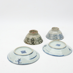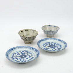 | Omschrijving | Lot van vier stuks Chinees porselein: twee antieke 19e eeuwse Chinees porseleinen schaaltjes en twee kommen, mogelijk Ming |