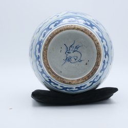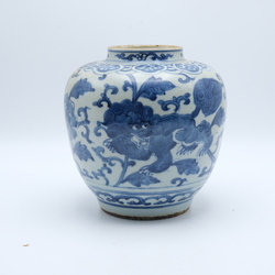 | Omschrijving | Een Chinees porseleinen gemberpot. Blauw/wit met een decor van twee tempel leeuwen tussen pioenrozen. Gemerk met konijntje op de onderzijde. |