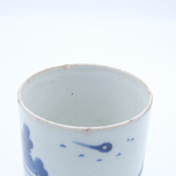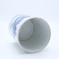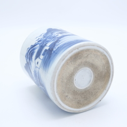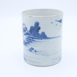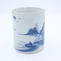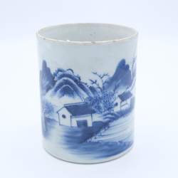 | Omschrijving | Een 19e/20e eeuwse Chinees porseleinen penselenpot met blauw-wit decor van huizen en visser aan de waterkant |