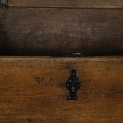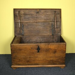 | Omschrijving | Een antieke 18e eeuwse eikenhouten dekenkist met gesmeed ijzeren slot, scharnieren en handgrepen. |