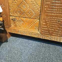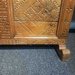 | Omschrijving | Een antieke 18e eeuwse dekenkist met smeedijzeren scharnieren op de deksel. De voorkant gestoken decor en tekst 'anno 1772' |