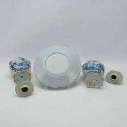 | Omschrijving | Lot divers 18e eeuws Delfts aardewerk: twee kastvazen, ca. 1760 in Louis XV stijl met rocailles en decor van vissers in landschappen. Met daarbij een bord met Chinoiserie decor van een figuur bij een tempel |