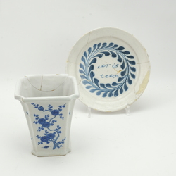 | Kavel | 746. Delfts jardiniere en bord, 18e eeuw |