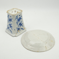 | Omschrijving | Een 18e eeuwse Delfts aardewerken jardiniere met blauw-wit decoractie van bloemen op tak, gemerkt D16. En een 18e eeuws spreukbordje met spreuk ‘eer is teer’ |