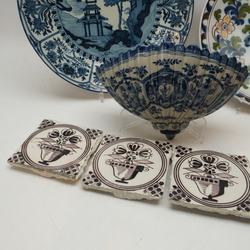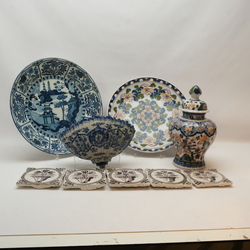 | Omschrijving | Lot divers Tichelaar Makkum: één met floraal decor, doorsnede 36 cm. Eén met blauw-wit chinoiserie decor, doorsnede 39 cm, gerestaureerd. Een polychroom gedecoreerde dekselvaas, 31 cm hoog, in goede staat. Een waaiervormige blauw-wit gedecoreerde wandvaas, in goede staat. (Correctie 25/08: betreft een Chinese Tichelaar replica, eind jaren '80 op de Nederlandse markt gekomen). Met daarbij vijf 19e eeuwse mangaan bloempottegels. |
