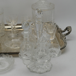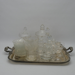 | Omschrijving | Lot divers kristal, waaronder een bloemenvaas met ruitslijpsel en een antiek 19e eeuws kristallen zuurstel, op een verzilverd dienblad. |