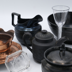 | Omschrijving | Lot diversen, waaronder een 18e eeuws basaltware theepotje (deksel gekramd), onderdelen van een vroeg 19e eeuws rouwserviesje, een roodkoperen pijpkomfoor en een slingerglas. |