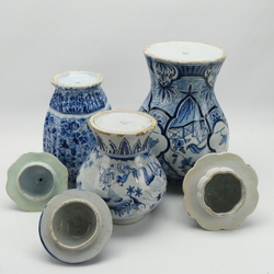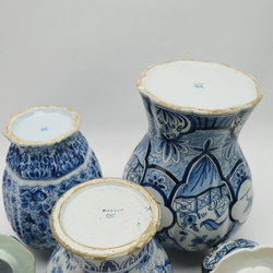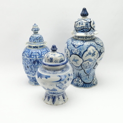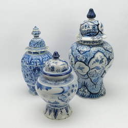 | Omschrijving | Drie antieke Fries aardewerken dekselvazen. Blauw/wit met diverse florale decors. Alle drie gemerkt voor Tichelaar, Makkum. Vroeg 20e eeuws. |