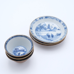 | Omschrijving | Lot van drie 18e eeuwse Chinees porseleinen kop en schotels, capucijner met onderglazuur blauw-wit beschildering van figuren in een landschap |