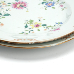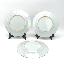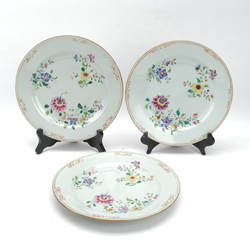 | Omschrijving | Lot van drie antieke 18e eeuwse Chinees porseleinen borden, Qianlong periode (1735-1796), met Famille Rose decor van bloemen, waaronder pioenrozen en rode randdecoratie. |