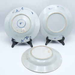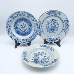| Omschrijving | Drie diverse 18e eeuwse Chinees posleinen schotels. Blauw/wit. Florale motieven op de randen en het plat. |
