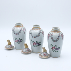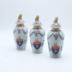 | Omschrijving | Drie Frans porseleinen dekselvaasjes, naar Chinese famille verte stijl. Voorzien van een wapen. Gemerkt voor Samson, Frankrijk. |