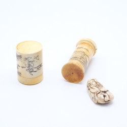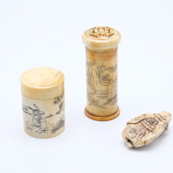 | Omschrijving | Lot van drie stuks antiek Chinees been: twee dekseldoosjes en een netsuke. |