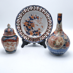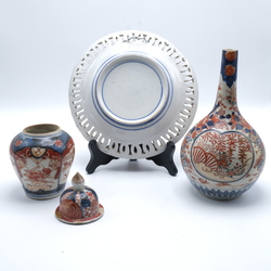 | Omschrijving | Een 19e eeuws Japans Imari pijpvaas, schotel met opengewerkte rand en een dekselvaasje. |