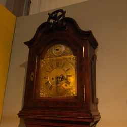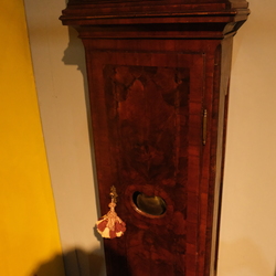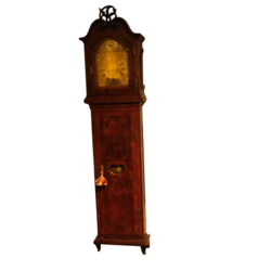 | Omschrijving | Een antiek 19e eeuws Duits staand horloge. Brede, gefineerde kast, kap bekroond met steekwerk. Wijzerplaat gesigneerd 'Fischer gothen'. Met gewichten en slinger |