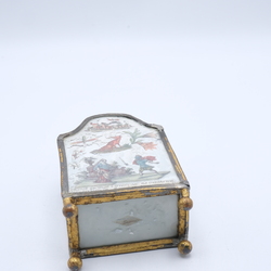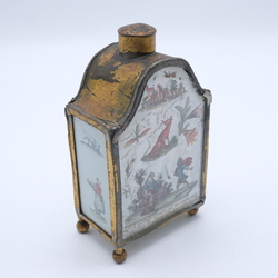 | Omschrijving | Een 18e eeuwse Duitse blikken theebus met glazen plaatjes versierd met ingekleurde kopergravures, geplaatst op bolpootjes. 15,5 cm hoog |
