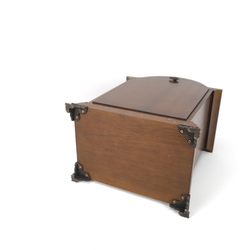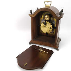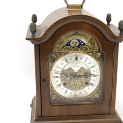 | Omschrijving | Een Engelse tafelklok met slagwerk naar een antiek model. In mahonie gefineerde kast. Met messing pootjes en aplicaties. Loopt goed. |
