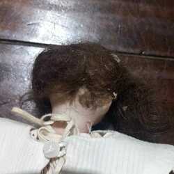 | Omschrijving | Een antieke pop met papiermaché armen en benen. Voorzien van een porseleinen hoofd. Gemerkt in de nek. Gekleed. |
