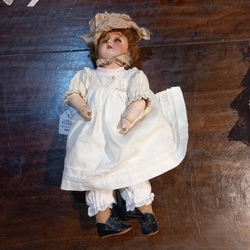| Omschrijving | Een antiek popje met papiermaché armen en benen. Met een porseleienen hoofdje en bruine pruik. Gemerkt H. W. Halbig. Gekleed. |