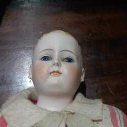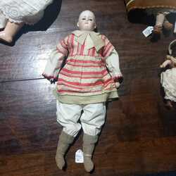 | Omschrijving | Een antieke Duitse jongenspop met porseleinen armen, benen en hoofd. Gekleed. |