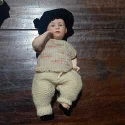 | Omschrijving | Een antieke baby pop met papiermaché armen en benen. Een porseleinen hoofd, gemerkt op het achterhoofd |
