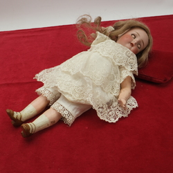 | Omschrijving | Een antieke pop met papiermaché armen en benen. Een porseleinen hoofd met slaapogen. Gemerkt K 26 R. Voor Simon & Halbig. Gekleed. |