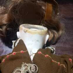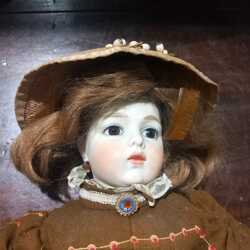 | Omschrijving | Een pop met stoffen lijf, porseleinen armen, benen en hoofd met gesloten mond. Voorzien van glazen ogen en licht bruin haar. Gemerk Bru (betreft een replica). Gekleed. |
