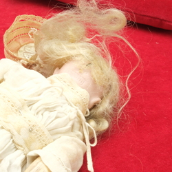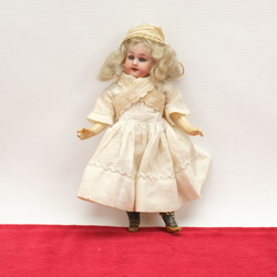 | Omschrijving | Een Duits antieke pop. Met papiermaché armen en benen en een porseleinen hoofd. Gemerkt Globe, Germany (C 3 H). Gekleed. |