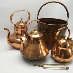 | Omschrijving | Lot koperen voorwerpen, bestaande uit een aker, Drie ketels, tabakspot en een tondeldoos met tang. |
