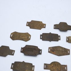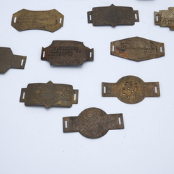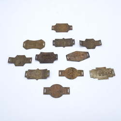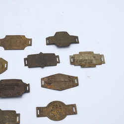 Lot van elf koperen fietsplaatjes, jaren ’30 en ’40. Gebruikt in Amsterdam.
