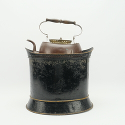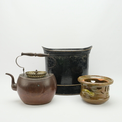 | Omschrijving | Een antieke 19e eeuwse schuitvormige blikken theestoof met groen aardewerken 20e eeuwse test, gesigneerd ‘stapelmans 1931’ (gelijmd) en antieke rood- met geelkoperen ketel met opengewerkte rand en houten greep |
