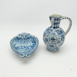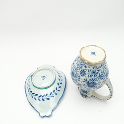 | Omschrijving | Een antieke Frans faiance oorkan, naar een Delfts voorbeeld en een dito schildvormig schaaltje gedecoreerd met putto en ramskop. |