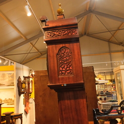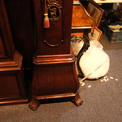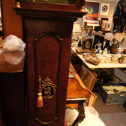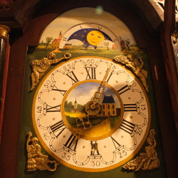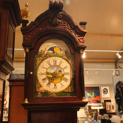 | Omschrijving | Een 20e eeuwse Friese staande klok, mahoniehouten gefineerde kast, beschilderde wijzerplaat met maanstand en ajour zaagwerk op de kap, bekroond met tollen |