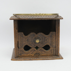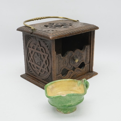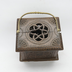 | Omschrijving | Een antieke 19e eeuwse eikenhouten stoof met koperen handvat en knop. Met initialen en datering 1892, bovenop opengewerkt met Turkse knoop |