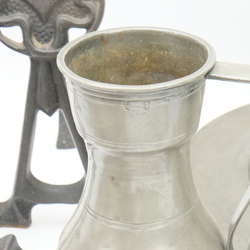 | Omschrijving | Een gietijzeren haardstel, Jugendstil met daarbij enkele stuks antiek tin, waaronder gemerkt Kamphof Zwolle, 'DS' en Engels. |