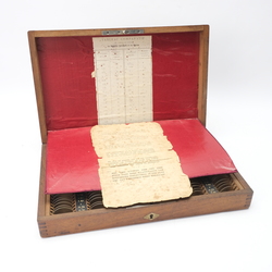 | Omschrijving | Houten doos gevuld met opticiensglazen in verschillende sterktes, gemerkt ‘Gudendag opiticien de la cour Kalverstraat Amsterdam’. Eind 19e eeuws of vroeg 20e eeuws |