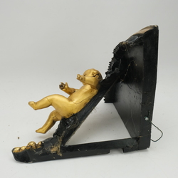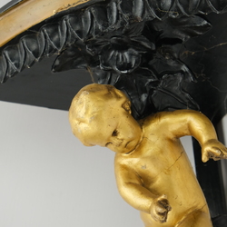 | Omschrijving | Een zwart gelakte hoek console versierd met een gestoken en verguld houten putto. |