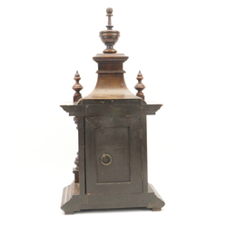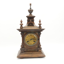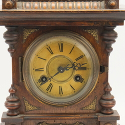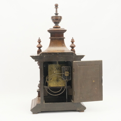 | Omschrijving | Een antieke 19e eeuwse houten pendule met gedraaide knoppen, koperen ornamentiek en Junghans uurwerk met bel |